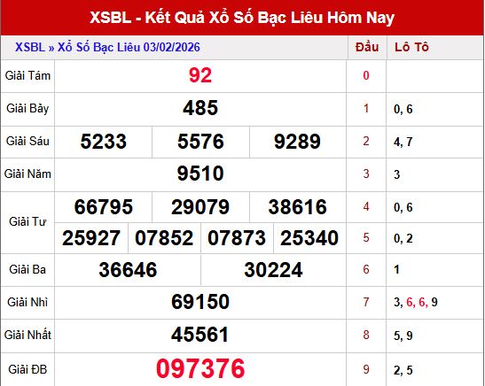 Các chuyên gia xstd tiến hành phân tích và soi cầu xổ số Bạc Liêu cho kỳ quay thứ Ba, ngày 10/02/2026 nhằm tìm ra những con số có xác suất xuất hiện cao. Các phương pháp được sử dụng đều dựa trên dữ liệu thực tế từ nhiều kỳ mở thưởng trước, giúp người chơi có thêm cơ sở tham khảo XSBL ngày 10/2/2026 hiệu quả.